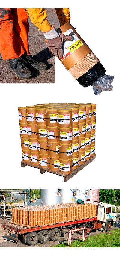 Los panes están recubiertos con un film de polietileno delgado de bajo punto de fusión que evita que el asfalto seadhiera a la caja de cartón. No es necesario descartar esta cobertura ya que a la temperatura detrabajo se disuelve y se incorpora al material.